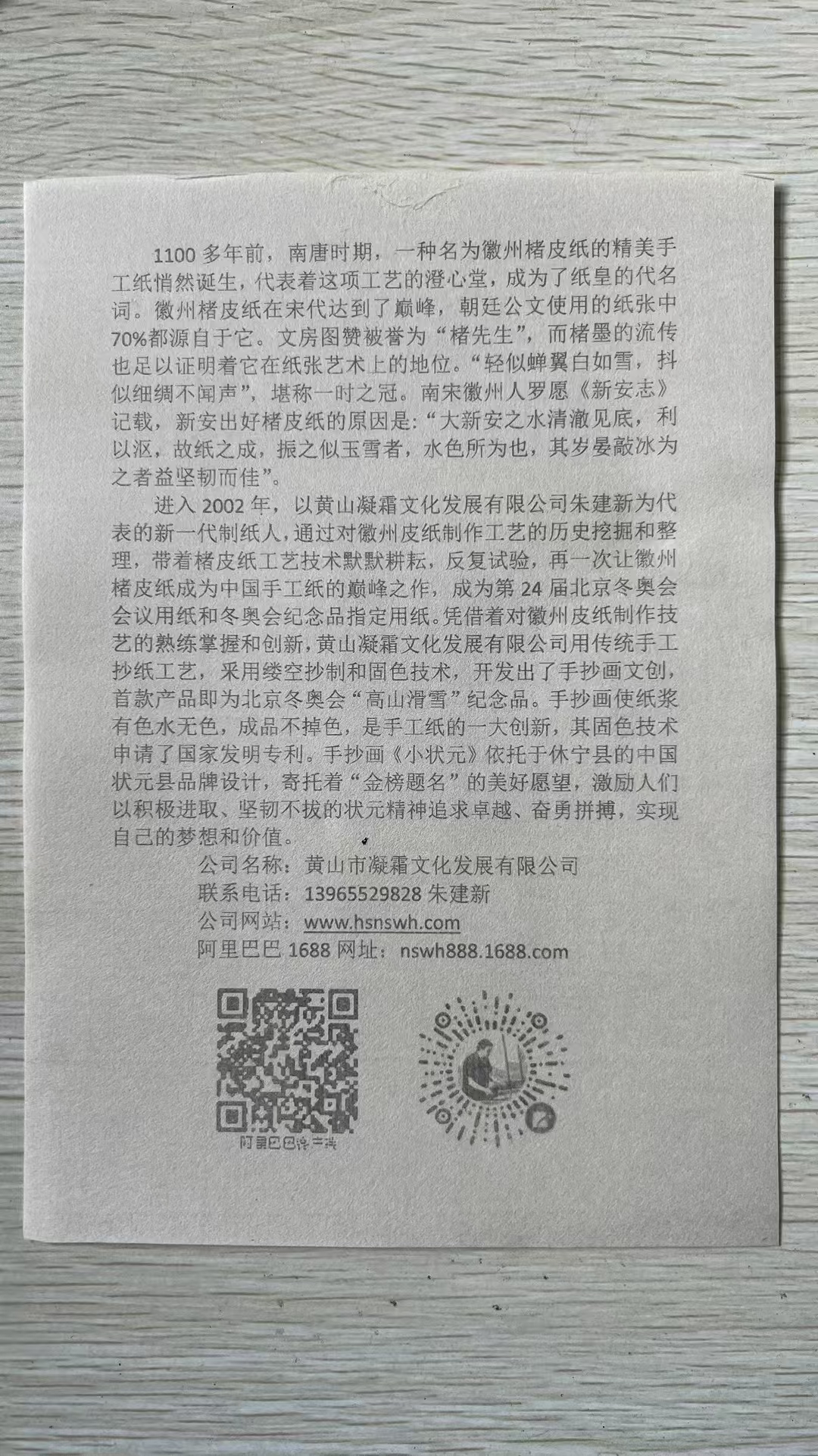 2020年公司實(shí)現(xiàn)了文化類規(guī)上企業(yè),迄今已申請了15項(xiàng)發(fā)明專利,19項(xiàng)實(shí)用新型專利,其中已授權(quán)發(fā)明專利3項(xiàng),實(shí)用新型專利11項(xiàng);2022年,公司為北京第24屆冬季奧運(yùn)會提供楮皮紙和紀(jì)念品,非遺傳承人朱建新被授予北京2022年冬季奧會參與證書,以感謝第24屆冬奧會取得圓滿成功做出的貢獻(xiàn)。2022年-2024年,朱建新被中國科技大學(xué)聘為《中國筆墨紙硯》全校公選課特聘導(dǎo)師;2023年,朱建新獲省級非遺傳承人稱號、“黃山工匠”稱號。